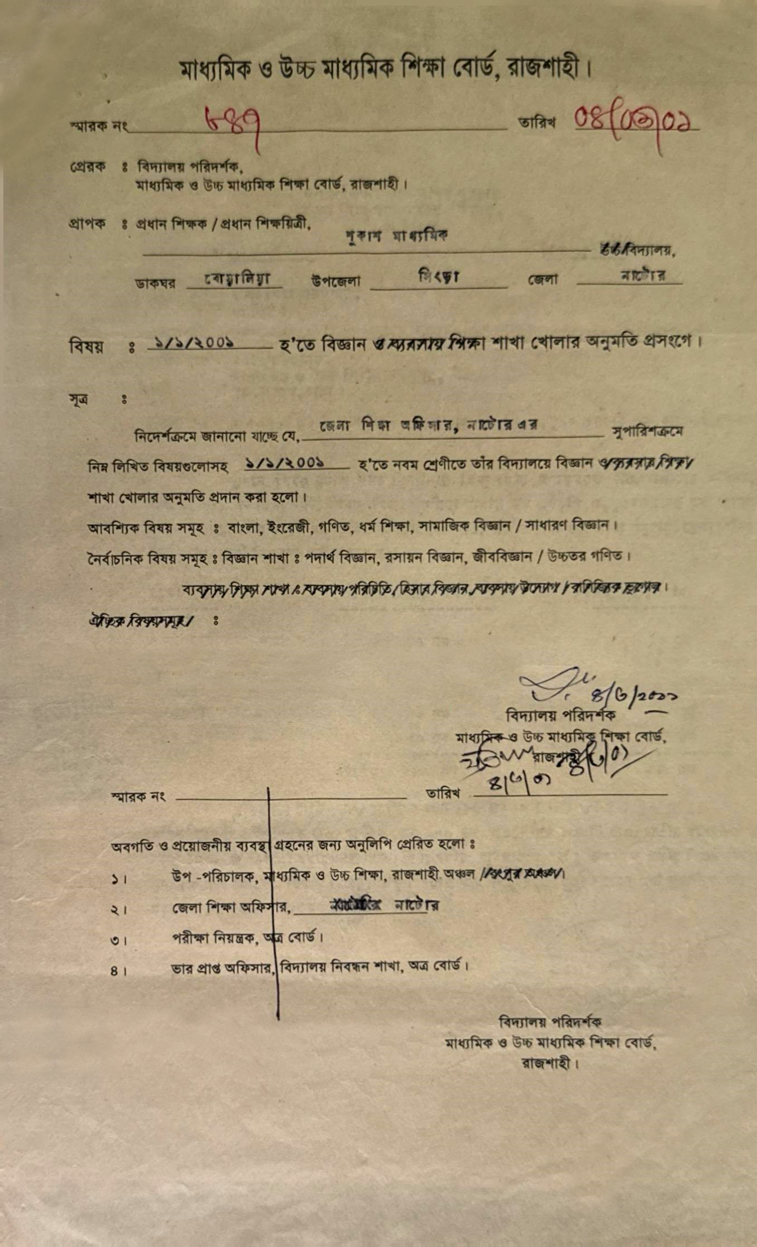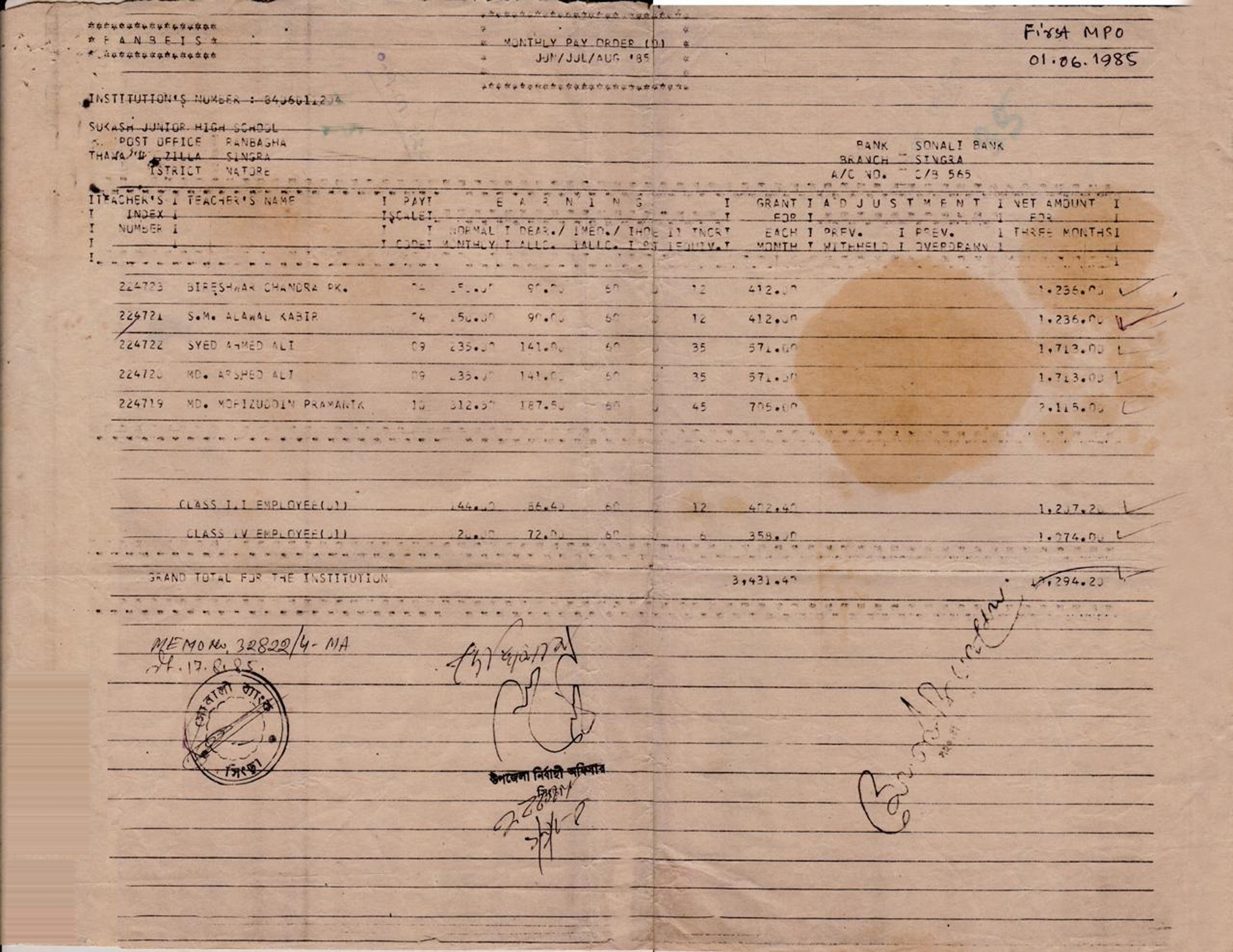 স্কুলের ১ম এমপিও ০১/০৬/১৯৮৫